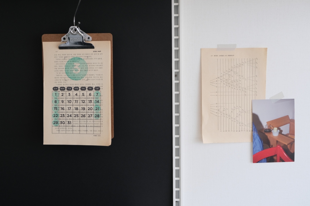 원래 제품 디자이너로 일하면서 주로 가구를 디자인했어요. 연구실에서 분기별로 대청소를 했는데, 할 때마다 원단 샘플부터 부피가 큰 시제품, 스케치 등등 온갖 쓰레기가 건물 2층 높이만큼 쌓일 정도로 어마어마하게 나오는 거예요. 처리하는 데만 3톤 트럭 두 대로 며칠씩 걸리는 걸 보면서 회의감이 확 들었어요. ‘난 뭐 하는 사람이지? 예쁜 쓰레기 만드는 사람 같다.’ 그래도 디자인은 너무 좋아서 계속하고 싶었고요. 그러던 중 달력을 만들 시기가 됐어요. 제가 주변 사람들한테 사근사근하게 먼저 연락하는 스타일이 아니어서, 1년에 한 번이라도 ‘내가 너를 참 이렇게 좋아해’ ‘늘 생각하고 있어’ 라는 마음을 전하고 싶어서 매년 달력을 만들거든요. 달력에 이런 고민을 녹여볼까 싶어서 친환경적인 소재를 찾다가 헌책이 눈에 들어왔어요. 책 내지에 오버 프린트를 해서 달력을 만들어보자 했죠.